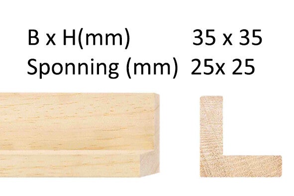 Baklijst blank hout smal 35 x 35 mm met ophang haak of draad.