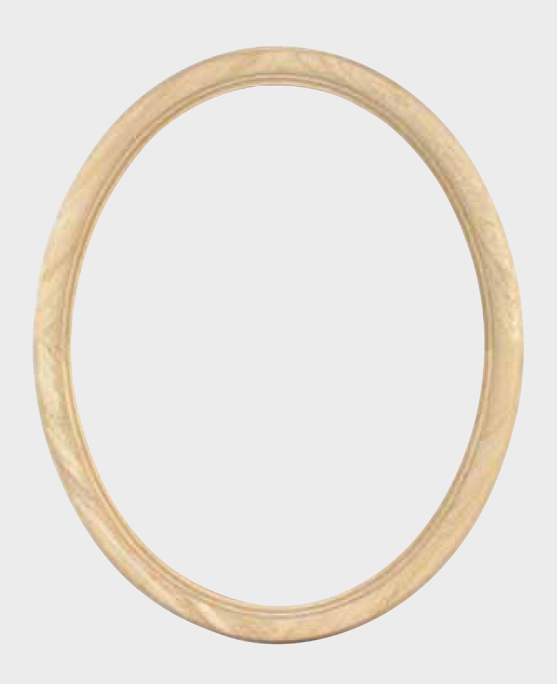 Ovale blanken houten lijst. De maat van de lijst betreft de binnenmaat van de sponning met een marge van ongeveer 3 mm rondom. De lijsten kunnen zowel los als met glas en achterkant worden aangeschaft. Ze zijn altijd uitgerust met een ophangsysteem.